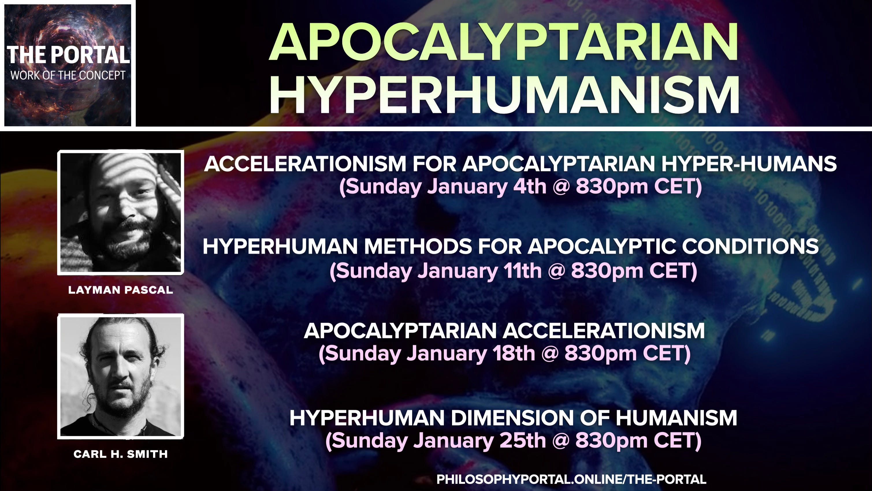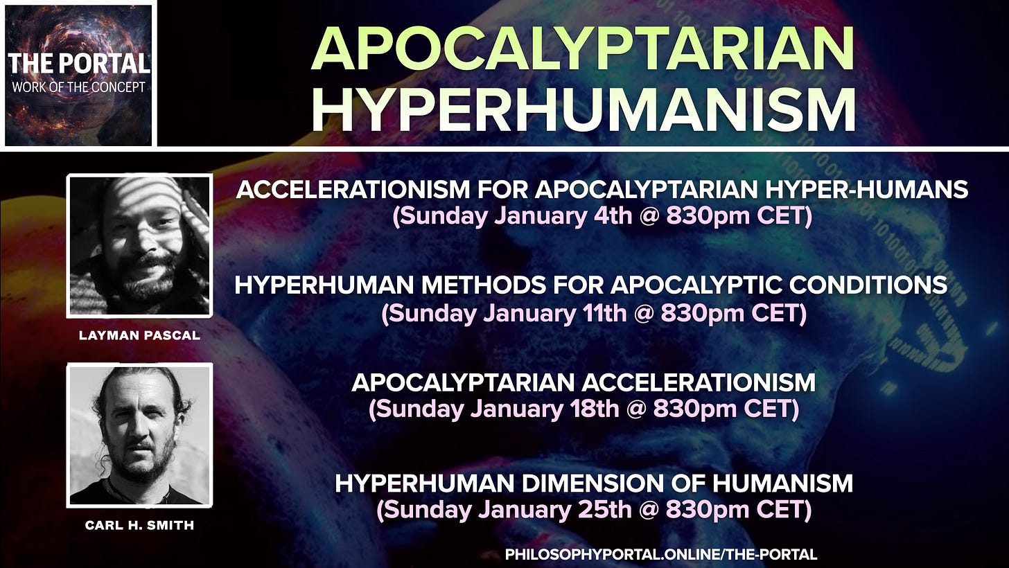 This month in The Portal we will be hosting Layman Pascal and Carl Hayden Smith for a series of sessions oriented around the concept of “Apocalyptarian Hyperhumanism”.